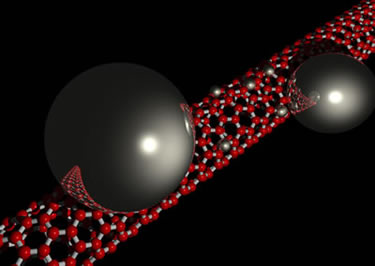 By applying a small electrical current to a carbon nanotube, they moved indium particles along the tube like auto parts on an assembly line. Their research, described in the April 29 issue of Nature, lays the groundwork for the high-throughput construction of atomic-scale optical, electronic, and mechanical devices that will power the burgeoning field of nanotechnology. “We’re not transporting atoms one at a time anymore — it’s more like a hose,” says Chris Regan of Berkeley Lab’s Materials Sciences Division, who co-authored the article along with fellow Materials Sciences researchers Shaul Aloni, Ulrich Dahmen, Robert Ritchie, and Alex Zettl. Aloni, Regan, and Zettl are also scientists in the University of California at Berkeley’s Department of Physics, where much of the work was conducted. The ability to shuttle a stream of particles to precise locations fills a void that has stymied the efficient assembly of nanostructures. For years, scientists have been able to simultaneously deliver millions of atoms to millions of sites simply by mixing chemicals. Although this fast technique has grown quite sophisticated, it remains far too blunt to build atomic-scale devices. On the other end of the spectrum is the ability to manipulate individual atoms, a feat that came of age in 1990 when IBM researchers spelled out the company logo by positioning 35 xenon atoms with a scanning tunneling microscope. Although precise, this technique is painstakingly slow, with no way to swiftly deliver atoms to the work area. “It’s either all at once, or excruciatingly serial,” says Regan. “So we combined incredibly precise localization with something that has higher throughput.” This middle ground is made possible by carbon nanotubes, which are hollow cylinders of pure carbon about ten thousand times smaller than the diameter of a human hair. Since their discovery in the sooty residue of vaporized carbon rods, these incredibly strong and versatile macromolecules have been engineered into frictionless bearings, telescoping rods, and the world's smallest room-temperature diodes. Now, they’re poised to change the way these and other devices are constructed.