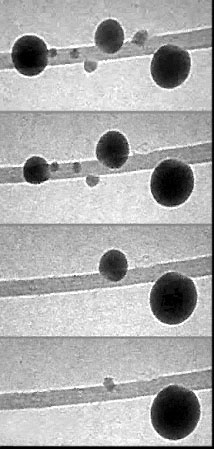 As described in their Nature article, the research team thermally evaporated indium metal onto a bundle of carbon nanotubes. The amount of evaporated metal is so small it populates the tubes’ surfaces as isolated indium crystals, instead of uniformly coating them. The bundle is then placed inside a transmission electron microscope, where a tungsten tip mounted on the end of a nanomanipulator approaches one nanotube. After physical contact is made between the tip and the free end of the nanotube, voltage is applied between the tip and the other end of the nanotube, creating a circuit. This sends an electrical current through the nanotube, which generates thermal energy that heats the indium particles. Next, if the voltage and thermal energy is carefully controlled, something strange occurs. Real-time video of the nanotube’s surface captures an indium particle as it disappears, while the particle to its right grows. Several seconds later, that newly enlarged particle also disappears, replaced by another even further to the right. Like squeezing the last bits of toothpaste from a tube, particles to the left become smaller while those to the right grow. In this manner, the thermally driven indium atoms inchworm along the nanotube, momentarily occupying a reservoir where a particle is located, and then moving to the next, until all of the indium piles up at the end of the nanotube. In the future, this nano-sized conveyor belt could be aimed anywhere scientists want to deliver mass atom-by-atom — the makings of a formidable nanoassembly tool. Moreover, if the voltage is slightly increased, the indium’s temperature increases, and the metal moves from left to right more quickly. “It’s the equivalent of turning a knob with my hand and taking macroscale control of nanoscale mass transport,” Regan says. “And it’s reversible: we can change the current’s polarity and drive the indium back to its original position.” In other words, indium can be repeatedly moved back and forth along the nanotube without losing a single atom. Nothing is lost in transit. This conservation of mass occurs because the atoms don’t evaporate from the system during their journey — an advantage in any process meant to deliver valuable material to a worksite. Instead, the atoms hug the nanotube’s surface as they move, tethered by a process called surface diffusion. “In order to build a structure we have to be able transport material to the construction site, and we’re developing a better way to do that,” Regan says. “Our nanoscale mass delivery system is simple and reversible. It requires only a nanotube, a voltage source, and something to transport.” "Carbon Nanotubes as Nanoscale Mass Conveyors," by Chris Regan, Shaul Aloni, Robert Ritchie, Ulrich Dahmen, and Alex Zettl, appears in the April 29, 2004 issue of Nature. Berkeley Lab is a U.S. Department of Energy national laboratory located in Berkeley, California. It conducts unclassified scientific research and is managed by the University of California. Visit our website at http://www.lbl.gov. |