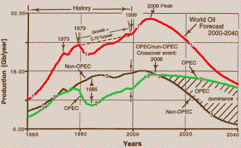 Notes: (1) World oil production is forecast to peak in 2006. (2) The OPEC/non-OPEC crossover event occurs in 2008. (3) The OPEC nations' rate of oil production from 1985 to 1999 increased by 9.33 times that of the non-OPEC nations.