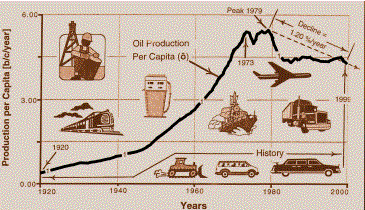 Notes: (1) World average oil production per capita (ô) grew exponentially from 1920 to 1973. (2) Next, the average growth rate was near zero from 1973 to the all-time peak in 1979. (3) Then from its peak in 1979 to 1999, ô decreased strongly by an average of 1.20%/year. (4) Typical response: "I didn't know that!" (5) The little cartoons emphasize that oil is by far the major primary source of energy for transportation (i.e. about 95% of the oil produced in 1999 was used for transportation).