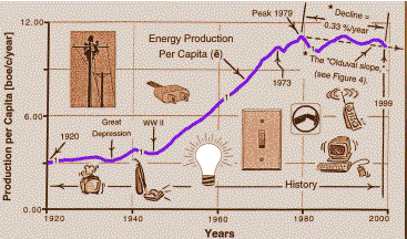Notes: (1) World average energy production per capita (ê) grew significantly from 1920 to its all-time peak in 1979. (2) Then from its peak in 1979 to 1999, ê declined at an average rate of 0.33%/year. This downward trend is the "Olduvai slope", discussed later. (3) The tiny cartoons emphasize that the delivery of electricity to end-users is the sin quo non of the 'modern way of life'. Not hydrocarbons.