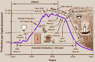 World energy production per capita from 1945 to 1973 grew at a breakneck speed of 3.45%/year. Next from 1973 to the all-time peak in 1979, it slowed to a sluggish 0.64%/year. Then suddenly —and for the first time in history — energy production per capita took a long-term decline of 0.33%/year from 1979 to 1999. The Olduvai theory explains the 1979 peak and the subsequent decline. More to the point, it says that energy production per capita will fall to its 1930 value by 2030, thus giving Industrial Civilization a lifetime of less than or equal to 100 years.