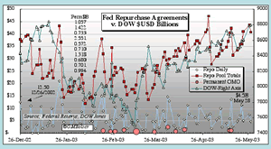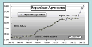Unconventional in this case may mean buying or monetizing various assets. In the January 2002 FOMC meeting reference was made to buying any kind of asset to pump up the system from US equities, government and municipal debt to real estate and gold mines. If one views the second storm front as a bear market in stocks where we have seen a decline for three straight years and despite twelve rate cuts by 2002, unconventional may also mean propping up the stock market. Injecting reserves into the financial system through Federal Reserve Repurchase Agreements is one method of achieving this. When the Fed purchases securities from primary government bond dealers, it pays for these securities with cash, thereby adding liquidity to the banking system. Member firms then have the available cash to carry out Fed intervention in the financial markets through major purchases made in the futures markets or through the purchase of select market weighted stocks that are included in all three major indexes such as Microsoft and Intel.